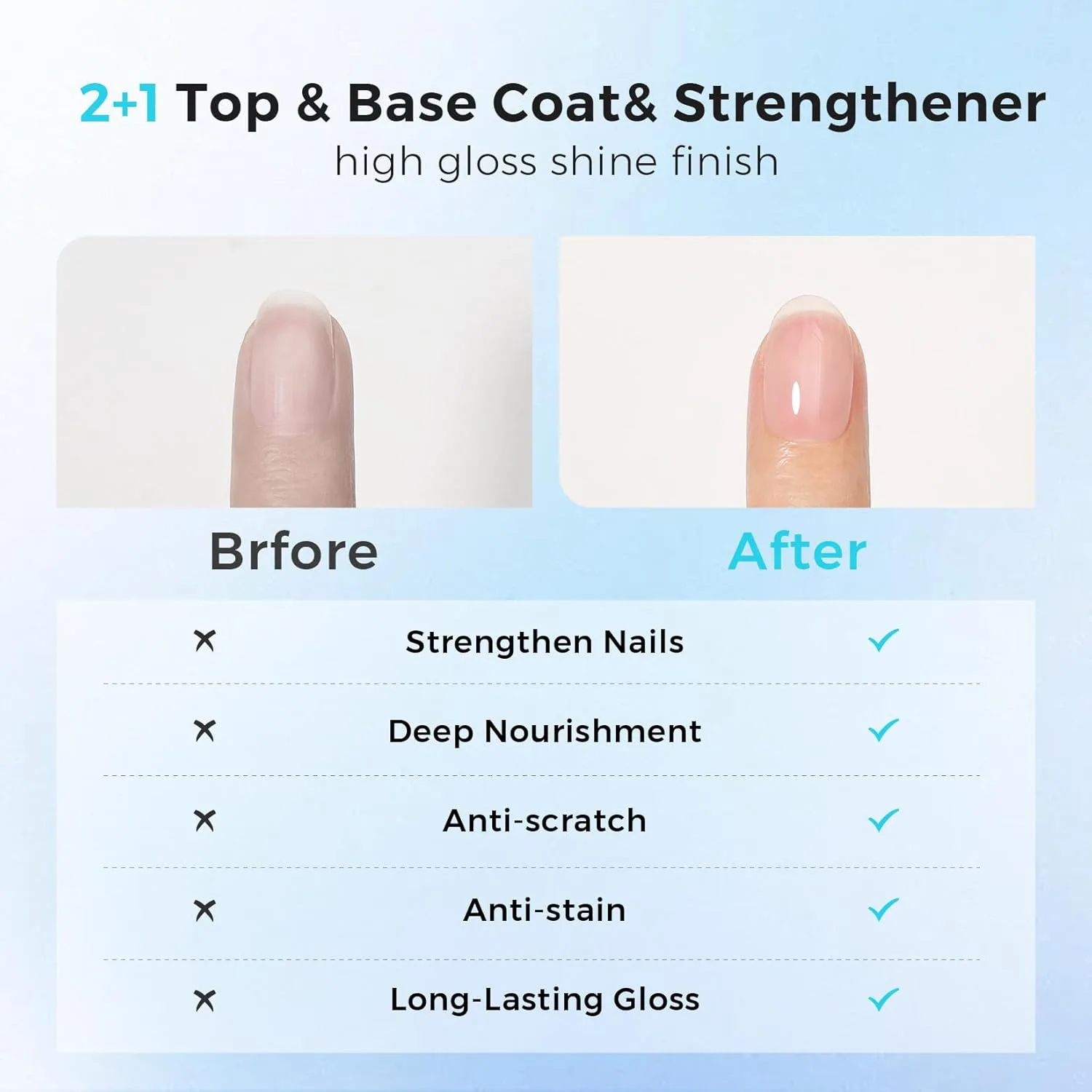 • You have complete flexibility! This 3-in-1 product works wonderfully as a standalone clear treatment, providing a low-shine, natural, healthy glow to your bare nails while strengthening them. It also acts as an effective ridge filler, creating a smooth canvas. Alternatively, it excels as both a protective base coat before applying coloured polish and a durable top coat afterward to enhance shine and extend the life of your manicure, preventing chips and stains.