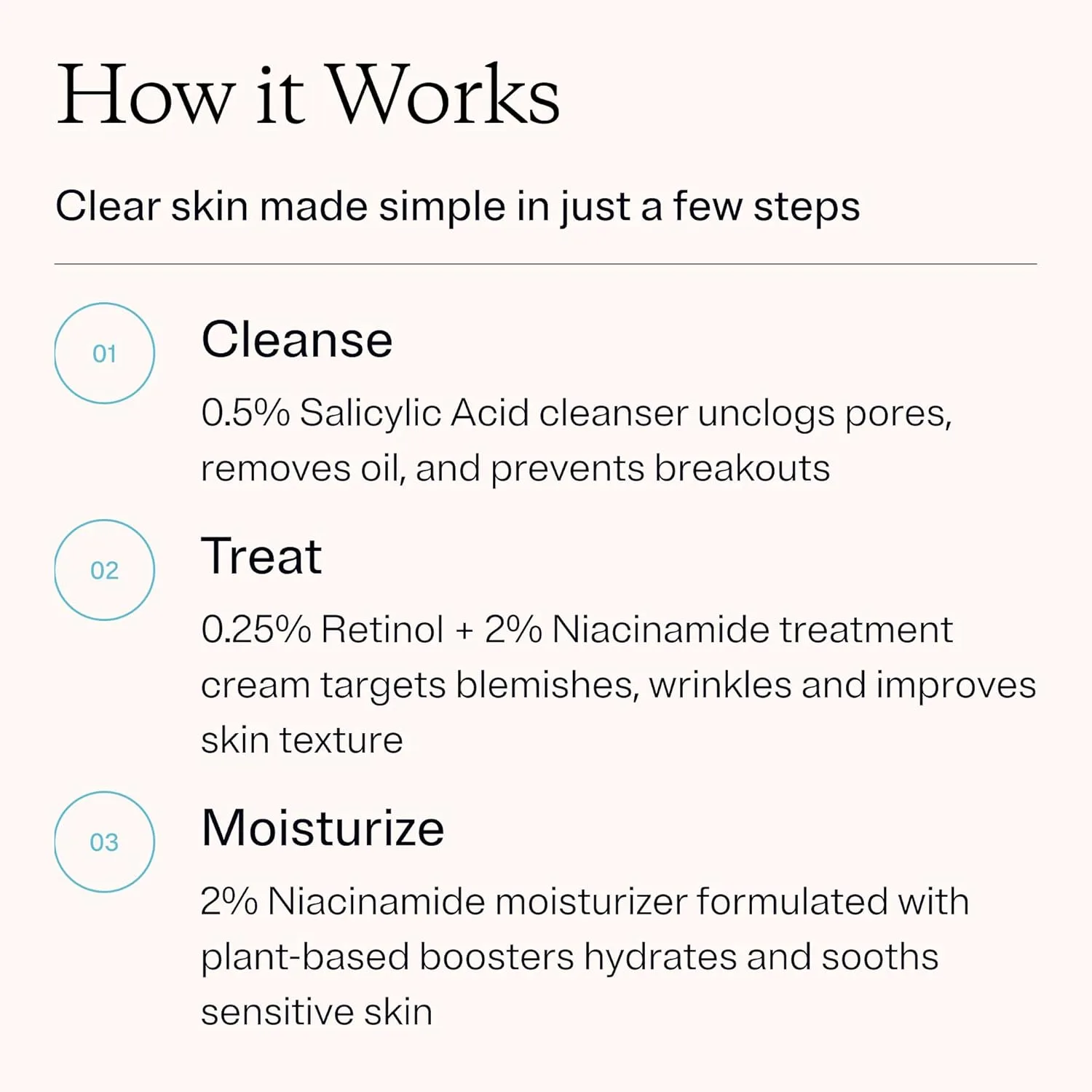 While powerful against acne, this kit is truly multi-functional. The star ingredient, 0.25% Retinol, is celebrated not only for its blemish-reducing properties but also for its ability to target fine wrinkles and uneven skin tone, significantly improving overall skin texture for a more youthful look. The Niacinamide in both the Retinol Cream and the Active Moisturizer further assists in improving skin elasticity and fading post-acne dark spots, giving you a comprehensive skin rejuvenation.