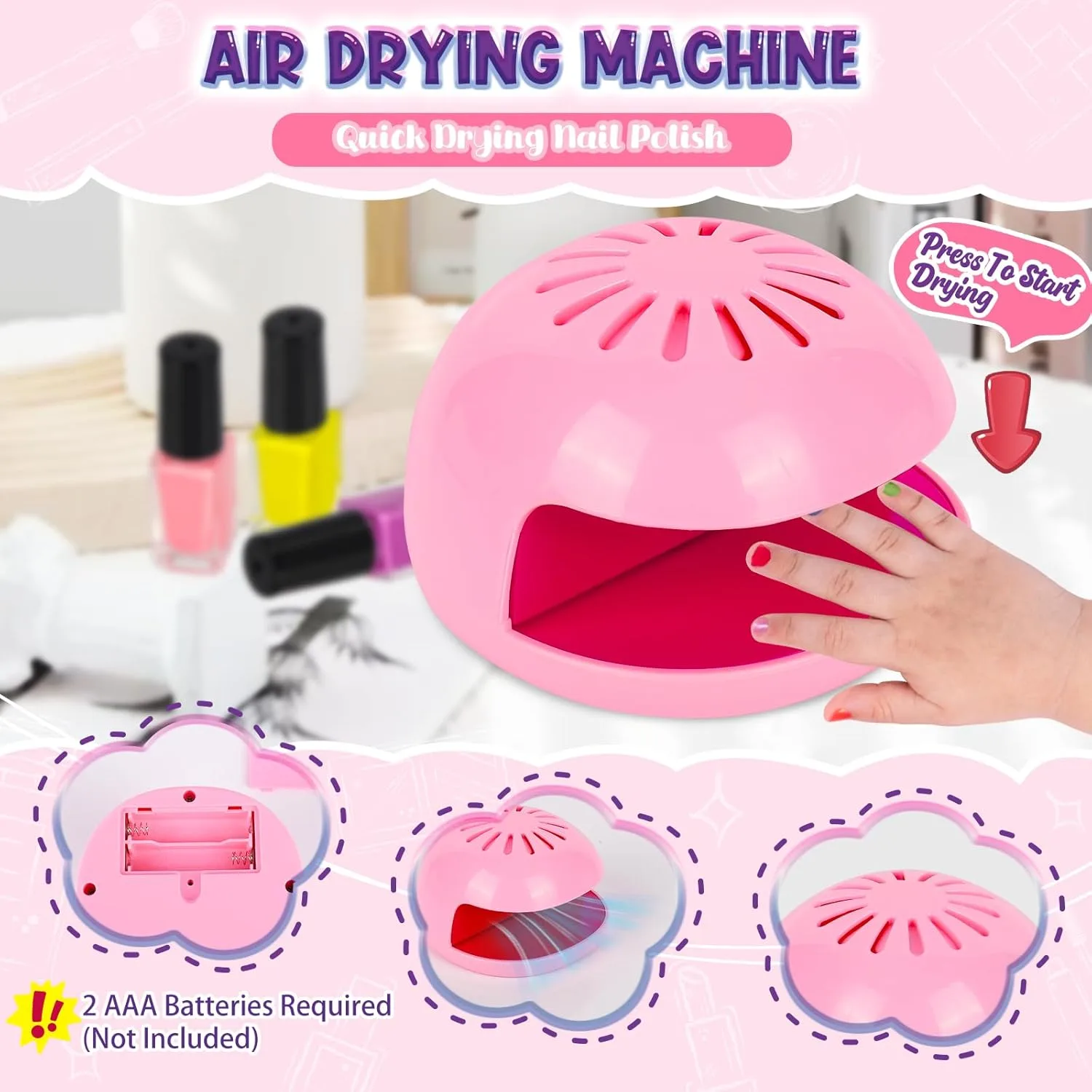 A: Yes, the included nail dryer works wonderfully to speed up the drying process! It’s designed to be very safe for children, utilizing a fan to dry the polish quickly (around 15 seconds per nail) without any harmful UV light. This feature adds to the ‘real salon’ experience and helps prevent smudges, building confidence in your child’s creations. Please note that the nail dryer requires 2 AAA batteries, which are not included in the set. We recommend having these on hand so your child can start playing right out of the box!